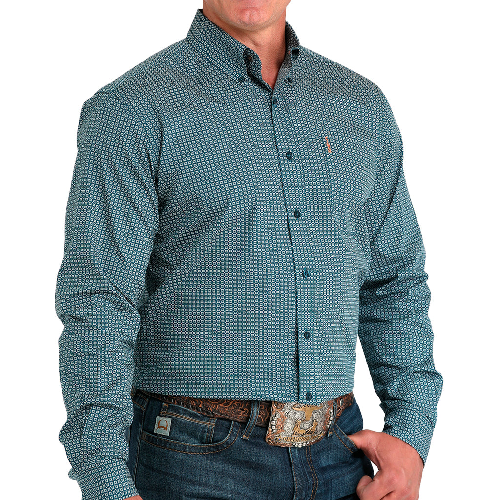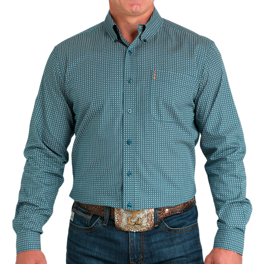 Nunca te equivocarás con una camisa de algodón liso con estampado verde azulado Modern Fit diseñada por CINCH. Esta elegante camisa cuenta con un bolsillo delantero izquierdo abierto, logo bordado y botones azules. Completa el look con vaqueros azules y botas vaqueras