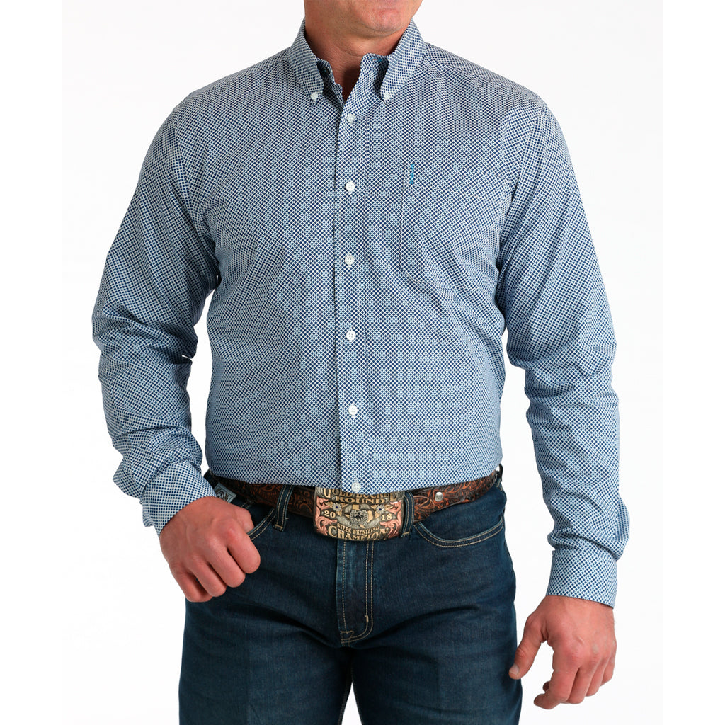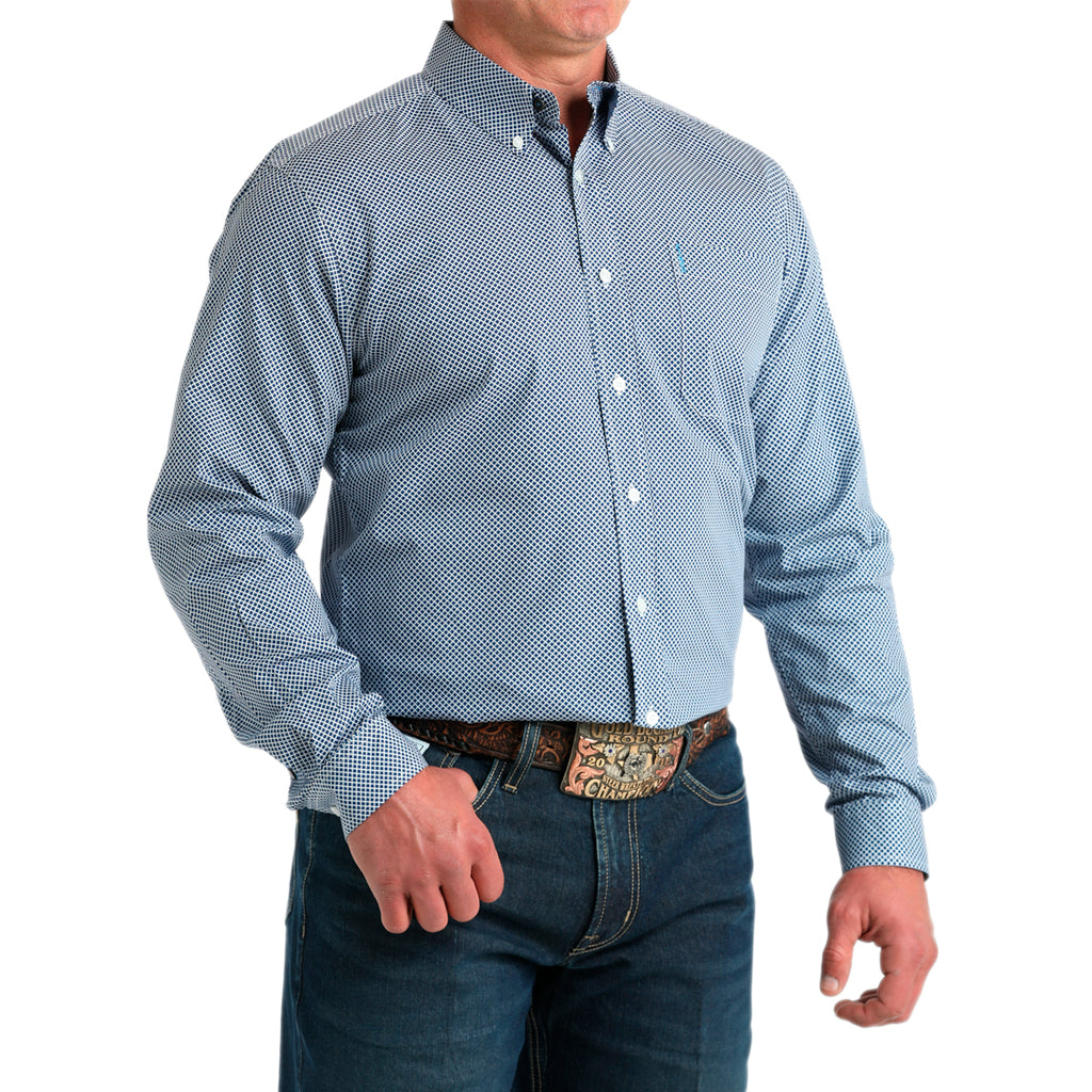 Esta elegante camisa de algodón liso con estampado azul rey te permite usarla todo el día con un estilo impecable. Diseñada con un corte moderno para un look impecable y a medida, esta elegante camisa cuenta con un bolsillo delantero izquierdo abierto, el logo Cinch bordado y botones blancos. Combínala con unos vaqueros azules nuevos o pantalones caqui para completar el conjunto.