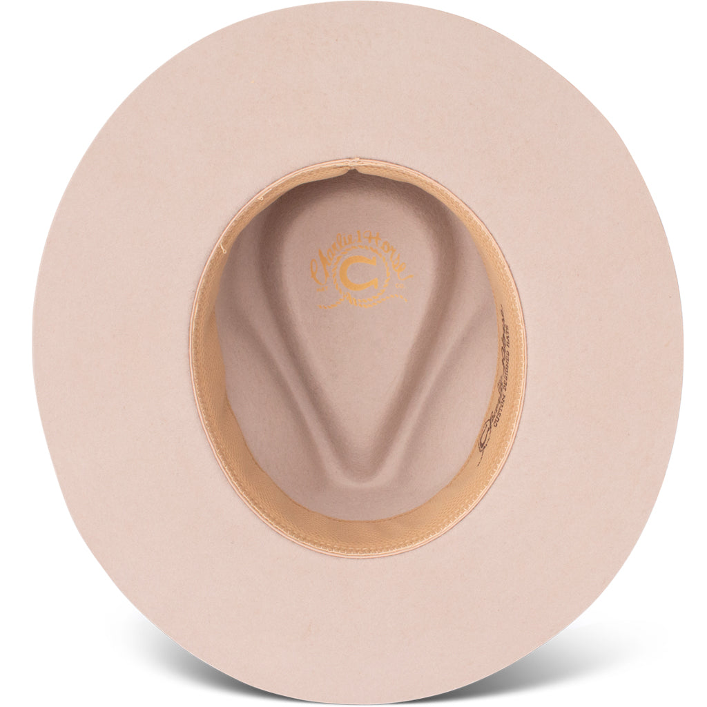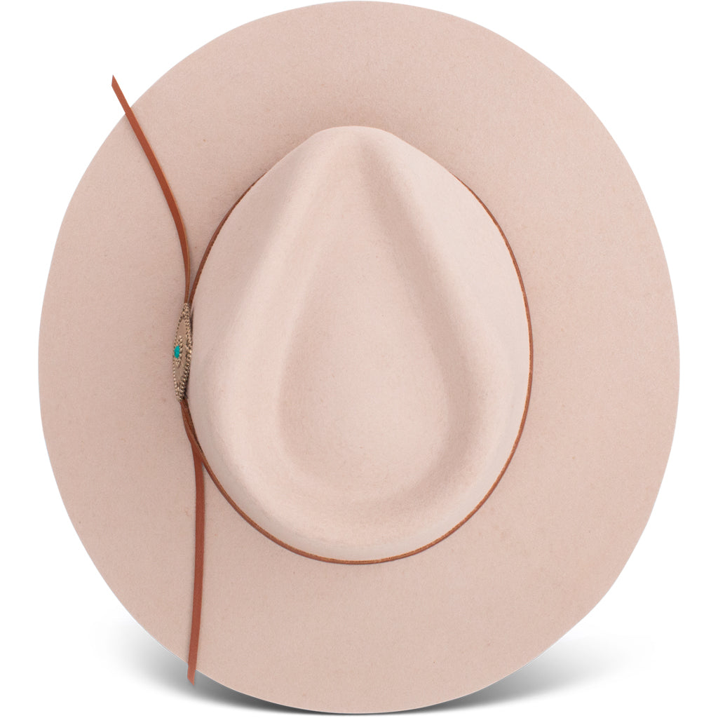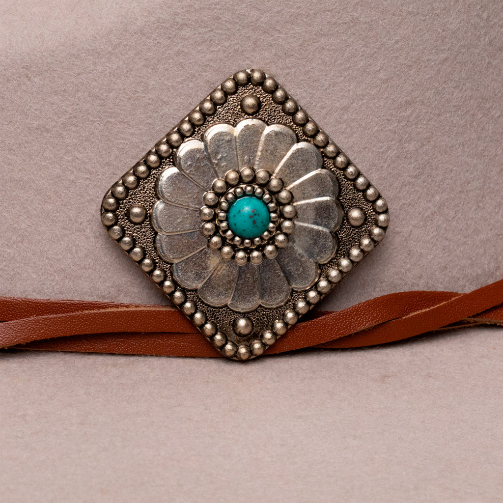 De ala corta y con el vientre plateado, el Lone Butte es una superestrella, desde la gama hasta la pasarela. Este sombrero tiene una copa de 9,5 cm con frente a presión, una diadema de tela para mayor comodidad y, por supuesto, un ala extra afilada de 7,6 cm. El concho lateral en forma de diamante presenta detalles florales con una pieza central turquesa, mientras que la cinta es de un sencillo color marrón rojizo. El logotipo de la marca Charlie 1 Horse adorna la copa. Parte de nuestra Colección Wanted, el Lone Butte fue un ejemplo de cómo ser deseado.