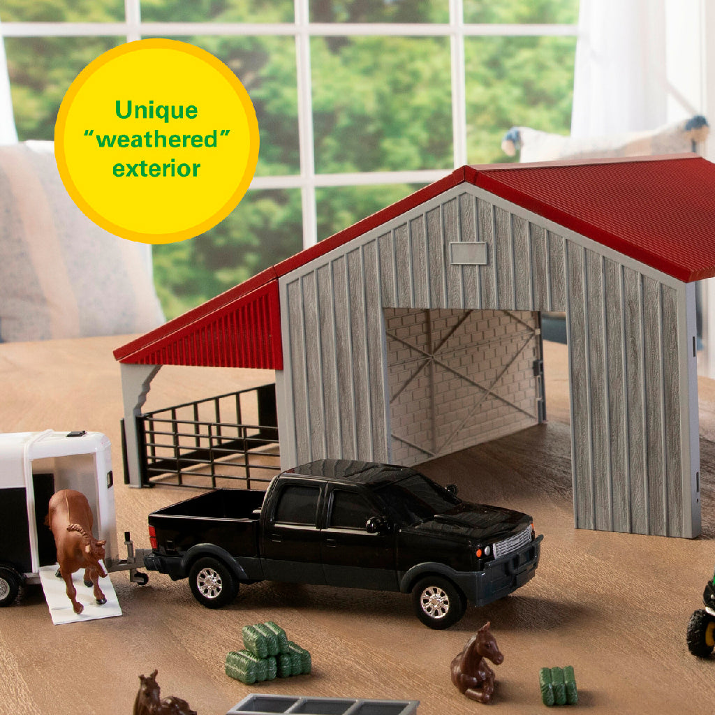 • Juego de juguetes de granja: 13 piezas que incluye granero, caimán John Deere RSX 860i, camioneta, remolque para caballos, 4 caballos de juguete, comedero y 4 pacas cuadradas