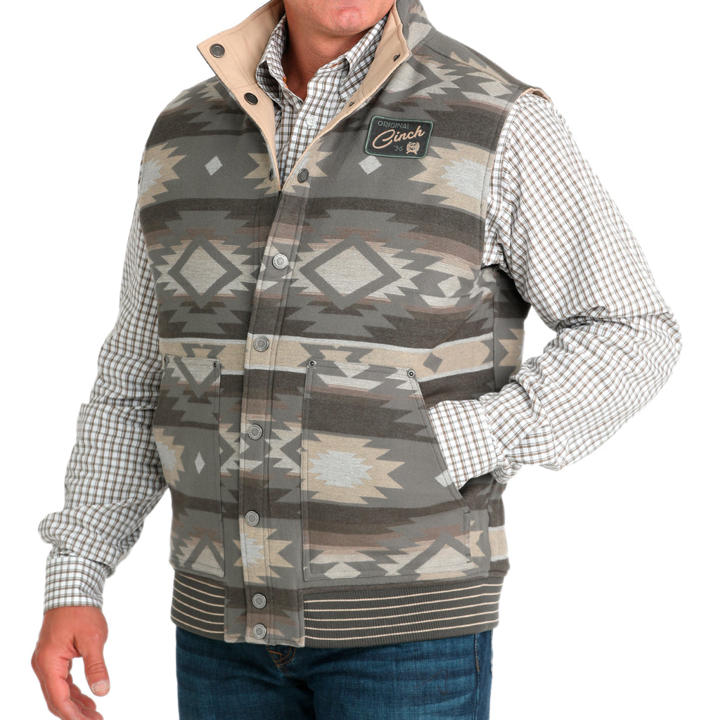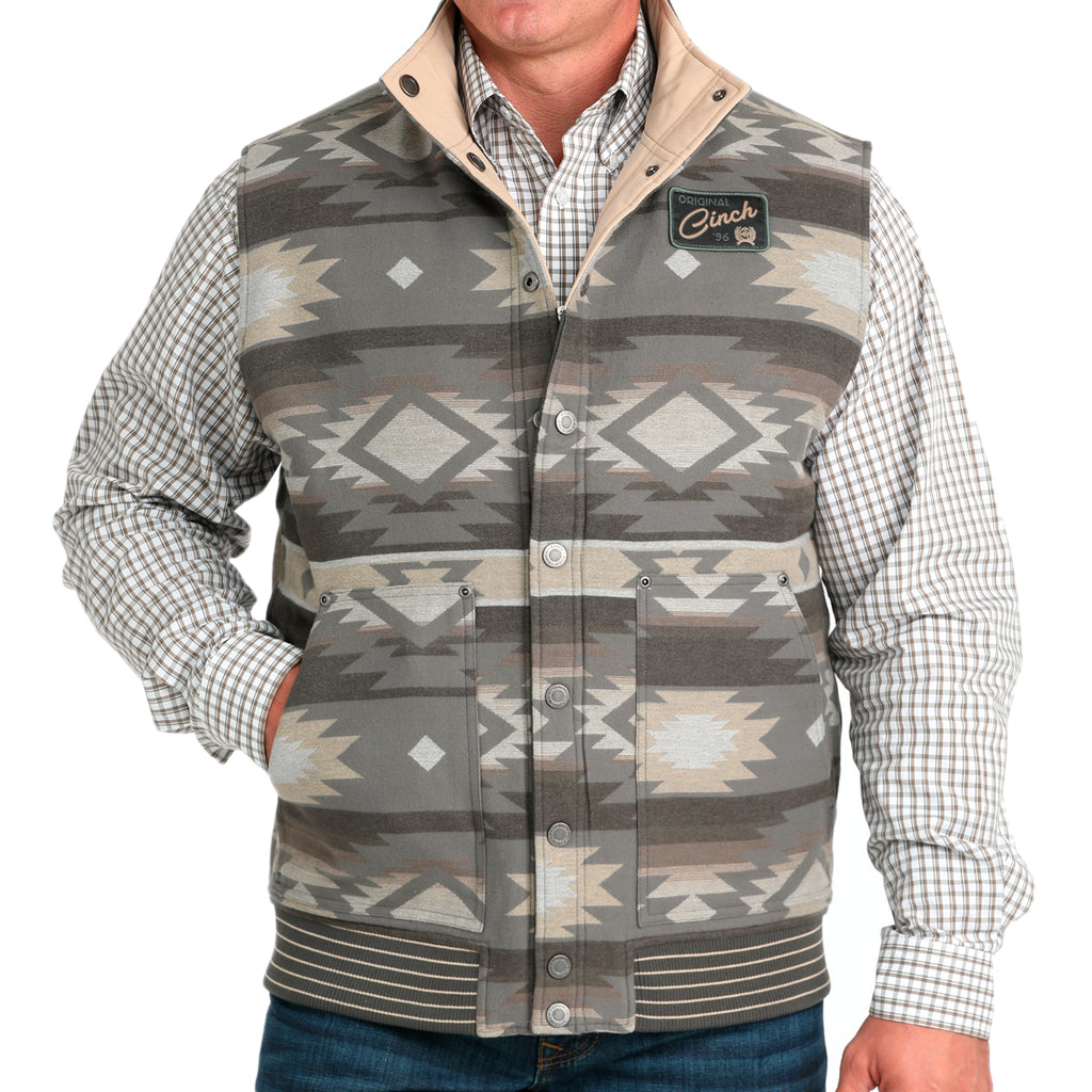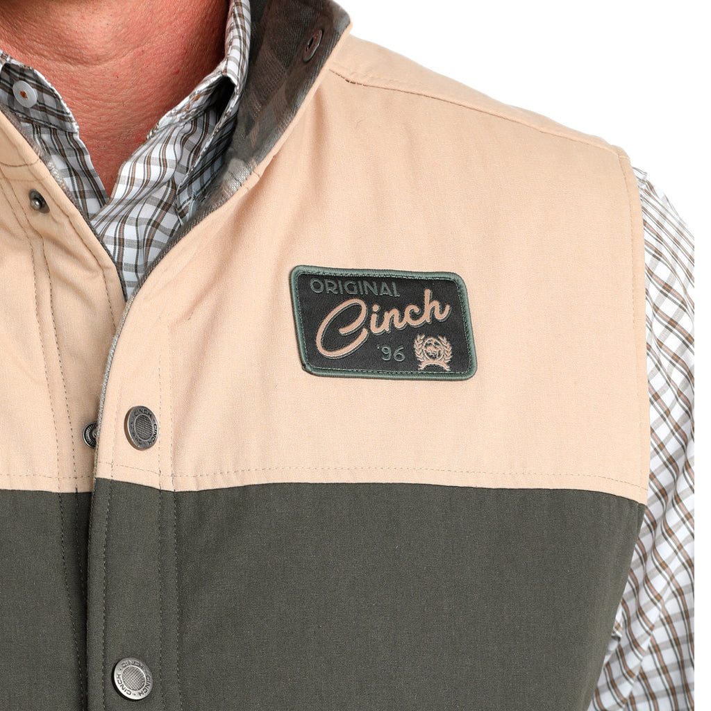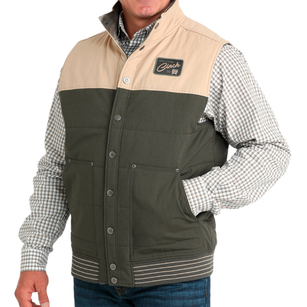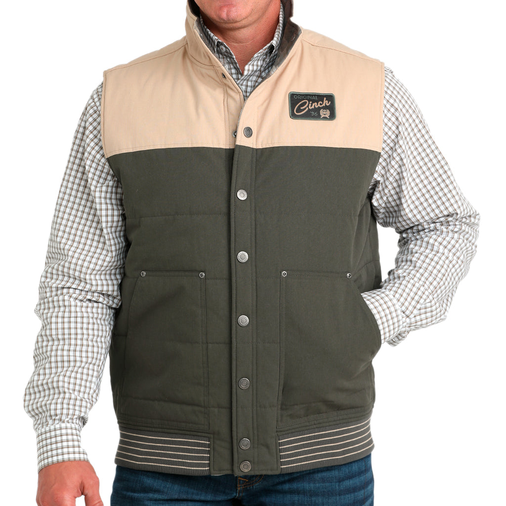 No busques más! Este chaleco acolchado reversible color oliva es cálido, protector y con un diseño que marca tendencia. Confeccionado en jacquard de algodón y lona encerada de poliéster y algodón, cuenta con dos bolsillos laterales, un parche tejido con el logo de CINCH y un acabado repelente al agua duradero (DWR).